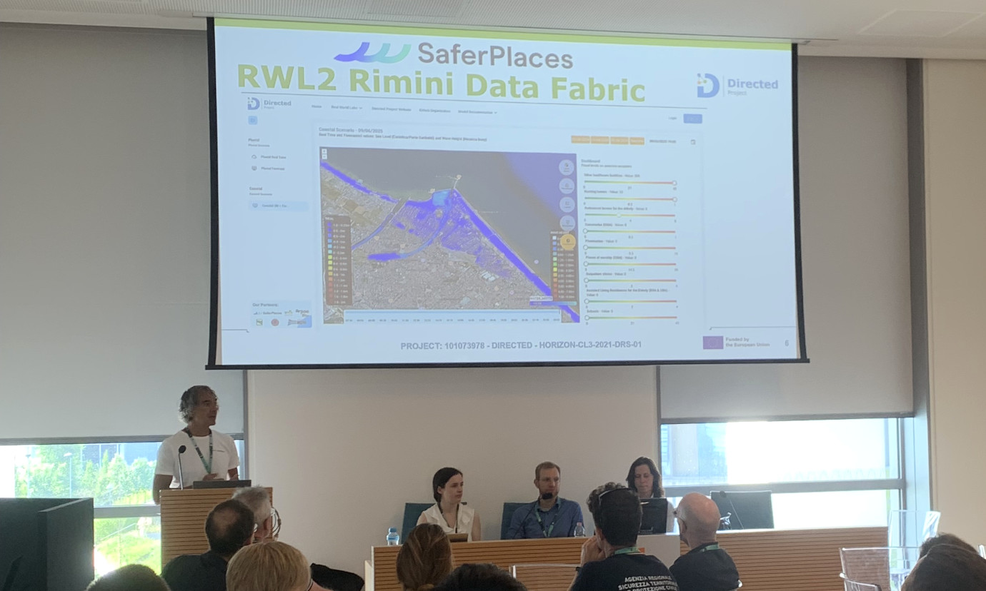 In addition, DIRECTED contributed a scientific session “Turning scientific research into actionable solutions by tackling challenges of interoperability in DRM and CCA” to the general program, fostering discussions among attendees and project members. There was also a side event, creating an opportunity for a “learning exchange on extreme flooding in Rimini using interoperable tools and governance frameworks.” The highlight of the session was the firsthand experience of local and regional civil protection staff, who shared their insights and took an active role in the discussion to refine the prototypical Data Fabric.