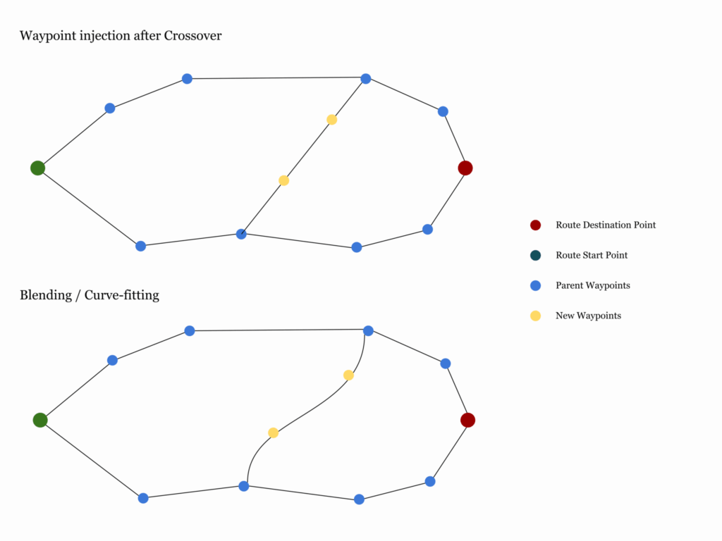 When crossing over diverse routes, we introduce new waypoints between crossover points to help smoothen our fitness estimation. This leads to new waypoints in the search space. - Blending and/or Curve-fitting